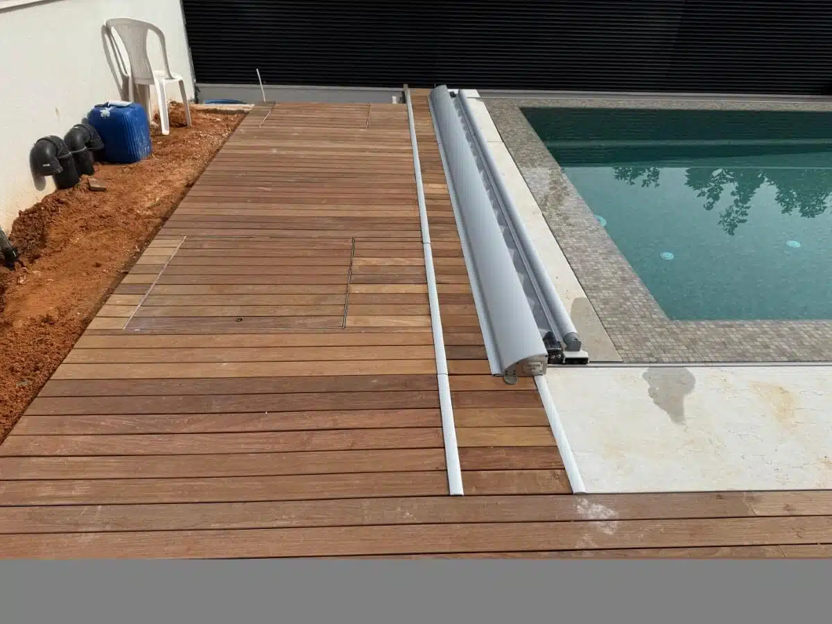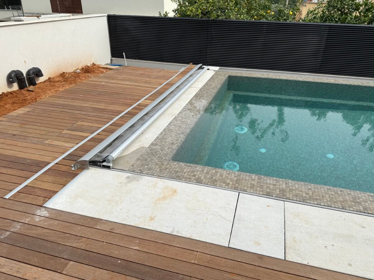 מערכת חיפוי בהלבשה על הריצוף הקיים עם קורת נשיאה ומגשי אלומיניום, מאפשר פירוק קל בעת הצורך לתיקון תקלות בתריס כיסוי הבריכה.